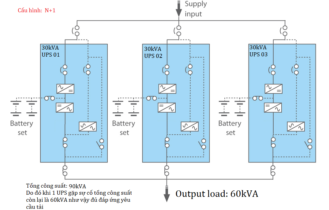 - Cấu hình N+1 : Trang bị gồm 2(UPS 30kVA) + 30kVA hoặc 3(UPS 20kVA) + 20kVA hoặc 6(UPS 10kVA) + 10kVA (Sơ đồ minh họa theo hình). Việc lựa chọn cấu hình tùy thuộc giải pháp thiết kế và các điều kiện sẵn có.