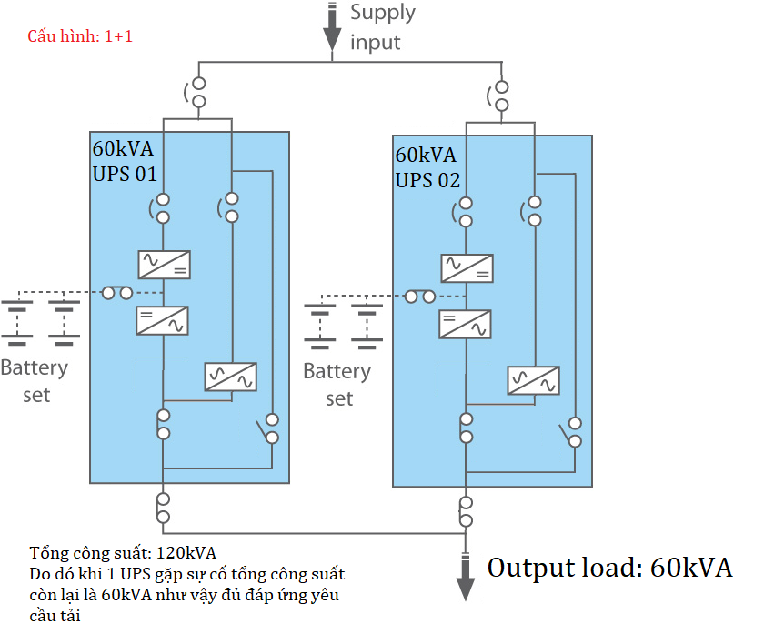 - Cấu hình 1+1 : trang bị gồm UPS 60kVA + UPS 60kVA